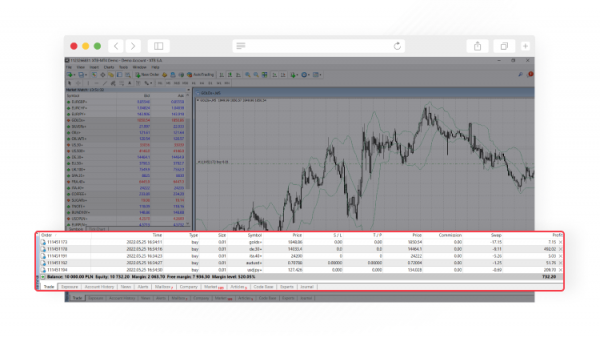Terminál je umístěn ve spodní části MT4 a umožní nám sledovat a řídit všechny naše otevřené obchody, čekající objednávky, historii obchodů, finanční přesuny, celkový zůstatek, majetek a marži blokovanou v obchodech.