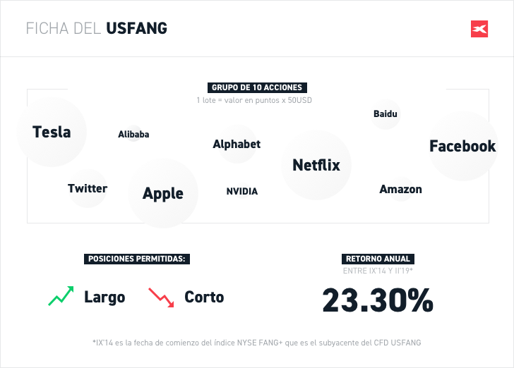 El índice CFD tiene las dos fortalezas principales: apalancamiento y escalabilidad. Si quisiera invertir en las 10 mejores acciones tecnológicas (Alibaba, Alphabet, Amazon, Apple, Baidu, Facebook, Netflix, NVIDIA, Tesla y Twitter) necesitará bastante capital. Pero con USFANG no sólo los tiene incluidos en un índice, sino que además sólo necesitará un depósito del 10% de la inversión para tomar una posición gracias al apalancamiento. La escalabilidad le permite obtener la posición más grande que desee. Un lote representa un valor de puntos por importe de 50 dólares, por lo tanto, si el índice está en 2600 puntos, sería de 130.000 dólares. Sin embargo, si desea que su posición sea de 50.000 dólares, puede invertir en 0,38 lotes. Para hacer eso, solo necesitas tener un depósito de 4.940 dólares. Por lo tanto, el USFANG es una excelente manera de invertir en acciones tecnológicas utilizando solo un instrumento.