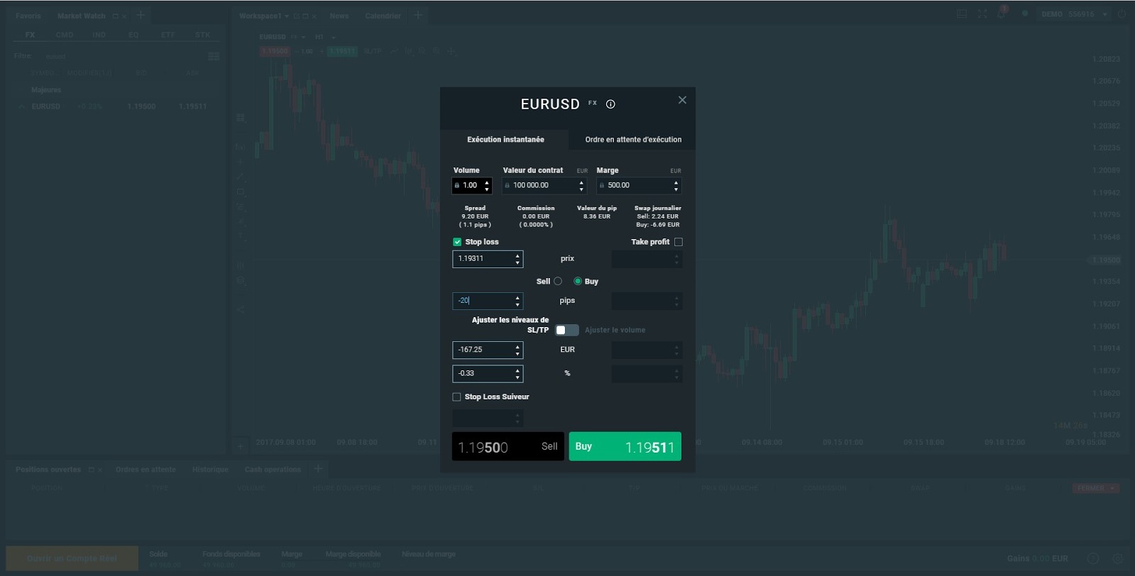 Sur l’exemple ci-dessus, un niveau de stop à 20 Pips a été paramétré sur l’ordre d’achat d’un lot sur l’EURUSD