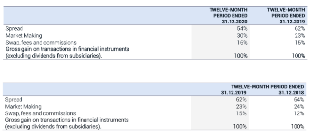 Az XTB bevételeinek másik része a tényleges árjegyzői tevékenység, ami azt jelenti, hogy a piac animálása és az ügyletek másik felének szerepvállalása. Ez a bevételek körülbelül 20-30%-át teszi ki. Nyilvánvaló, hogy az összeg a tárgyidőszaktól függően változik (a rövid távú volatilitás miatt), de hosszú távon a nullára törekszik, miközben a tranzakciós spread-bevételek növekednek. Az alábbi táblázat a konszolidált éves jelentés része, és az egyes XTB bevételi kategóriák százalékos arányát mutatja be a 2018-2023-as években, a bruttó pénzügyi eszközökkel kapcsolatos műveletek hatására.