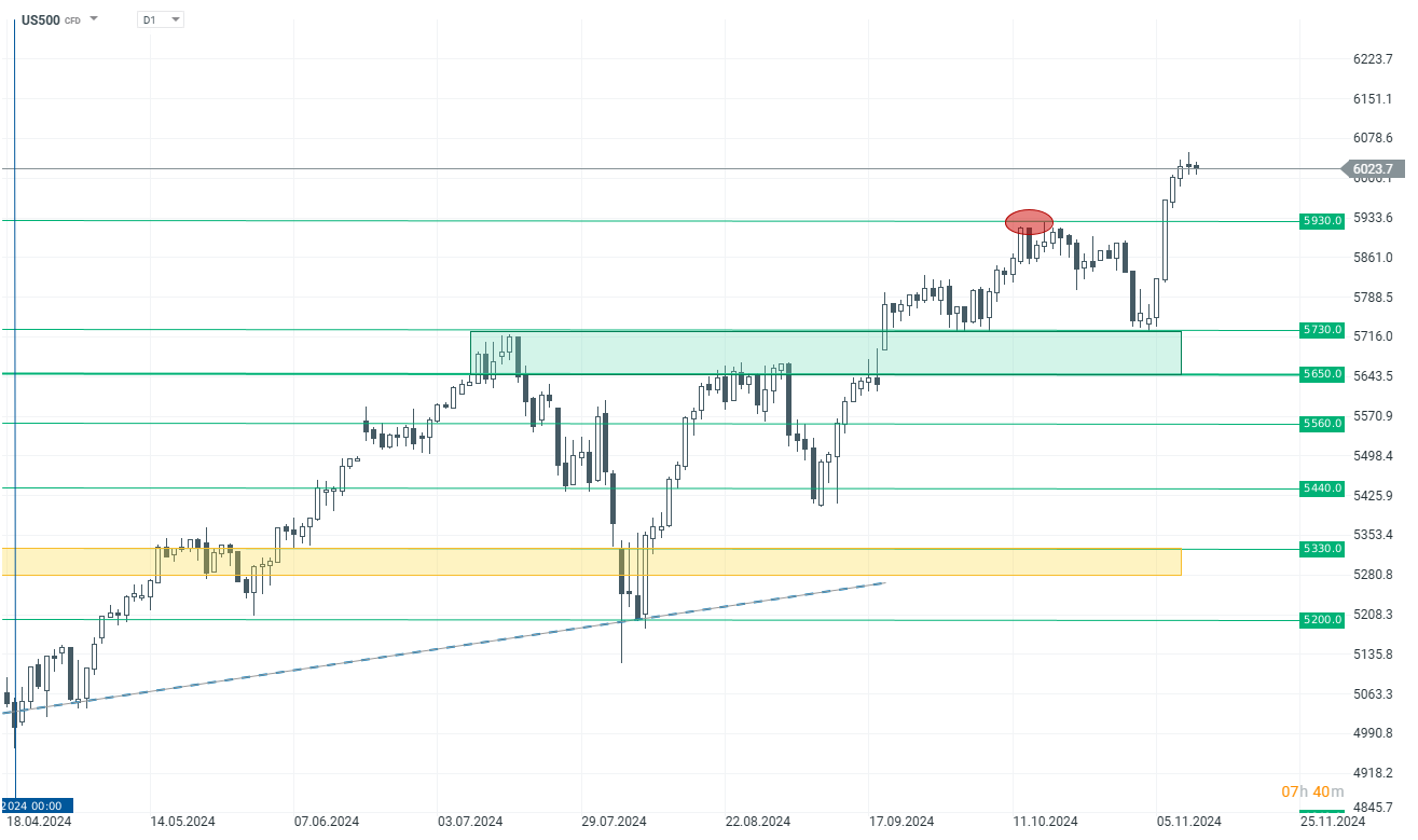 La sessione cash nel mercato statunitense inizia con qualche presa di profitto dopo i recenti guadagni dinamici. Tuttavia, i livelli chiave per gli indici sono mantenuti, e poco dopo il mercato mostra anche lievi guadagni. L'aumento recente del mercato azionario avviene nonostante la pressione di un apprezzamento del dollaro. Oggi, il USD ha guadagnato un altro 0,45%, raggiungendo i 105,8000 punti, il livello più alto da aprile 2024, nonostante la Fed abbia avviato un ciclo di riduzione dei tassi. Al momento non ci sono preoccupazioni significative per il mercato dei cambi, poiché il cosiddetto Trump Trade continua dopo le elezioni della scorsa settimana. Tuttavia, a lungo termine, un dollaro forte potrebbe gradualmente esercitare pressione sul mercato azionario.