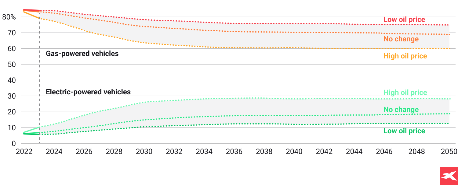 Nota: I dati includono le vendite di veicoli elettrici a batteria (BEV) e ibridi plug-in (PHEV) dal 2022, insieme alle proiezioni di vendita per il periodo 2023-2050. Il termine "Nessun cambiamento" si riferisce alle vendite previste in assenza di nuove leggi o regolamenti, con un prezzo del petrolio fissato a 101 dollari al barile entro il 2050, espressi in dollari del 2022. Le proiezioni con un prezzo del petrolio basso assumono un prezzo di 51 dollari al barile, mentre quelle con un prezzo del petrolio alto prevedono un prezzo di 190 dollari al barile.