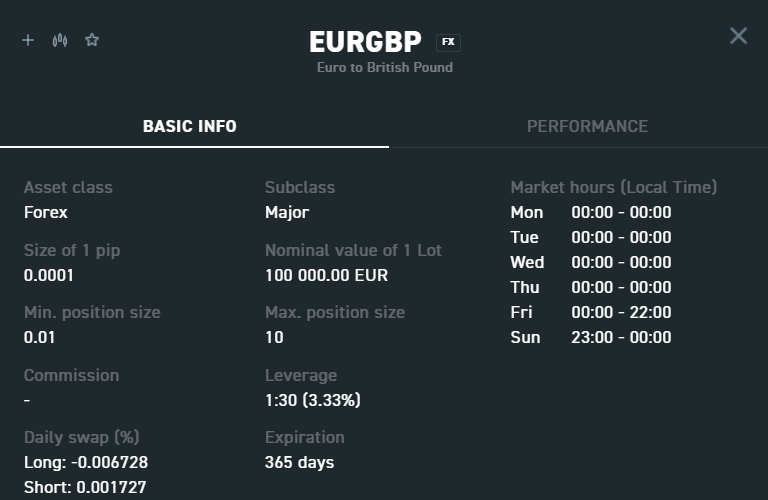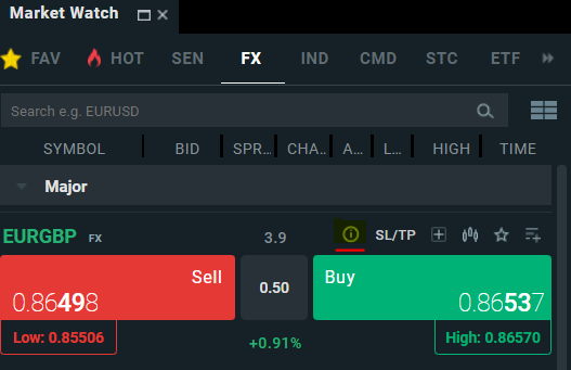 🔍 Per controllare i dettagli dello strumento sulla piattaforma xStation, è possibile cercare lo strumento nella finestra Market watch e quindi fare clic sull'icona "i".