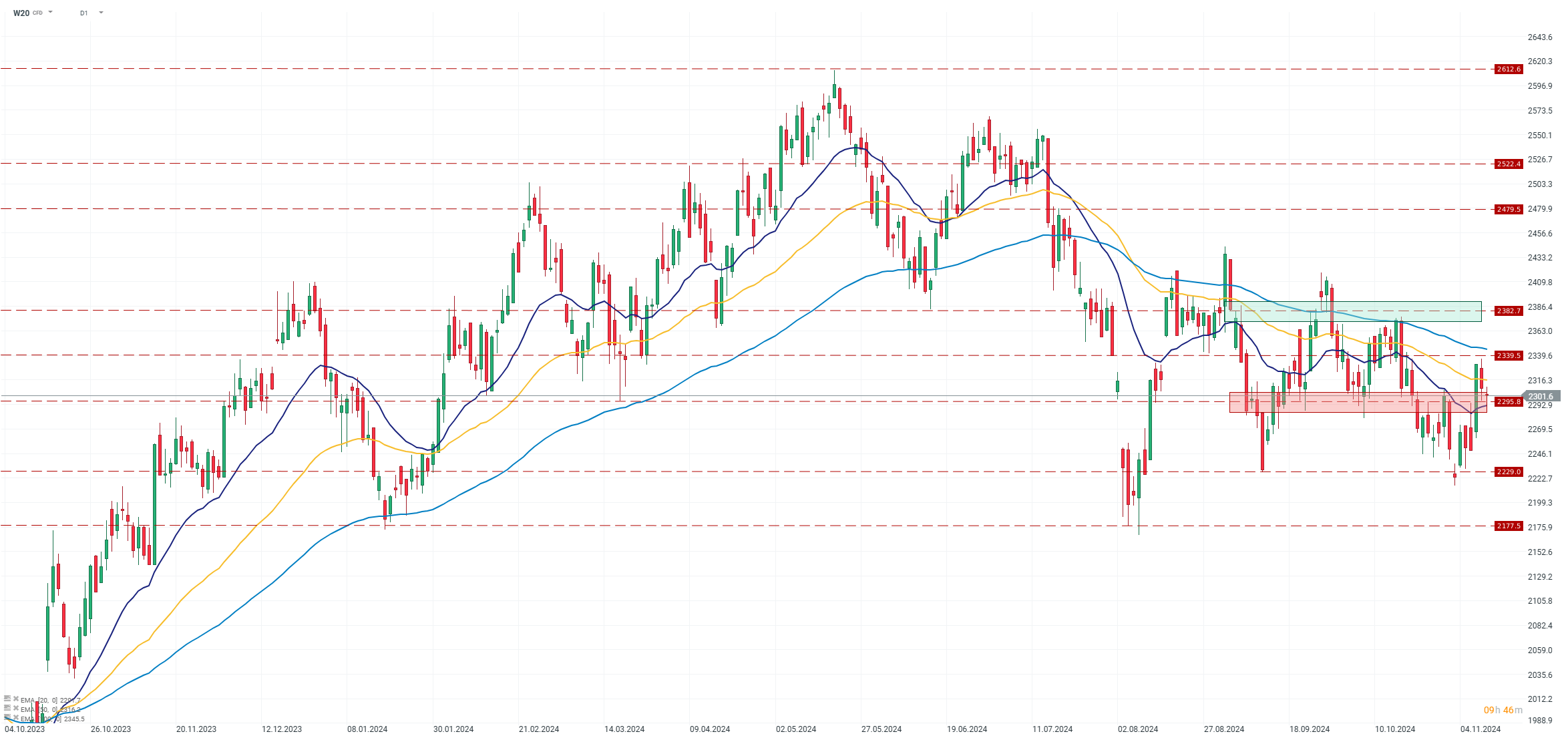 Notowania kontraktu na indeks WIG20 (W20) wracają w okolice dolnego ograniczenia kanału bocznego. Wybicie się poza poziom wsparcia wynoszący 2295 pkt. może zainicjować ruch wymazujący wzrosty zapoczątkowane wygraną w wyborach Trumpa, tym samym przeceny mogą sięgnąć 2229 pkt., gdzie znajduje się pierwszy ważniejszy poziom wsparcia wyznaczony przez wrześniowe lokalne dołki. Źródło: xStation