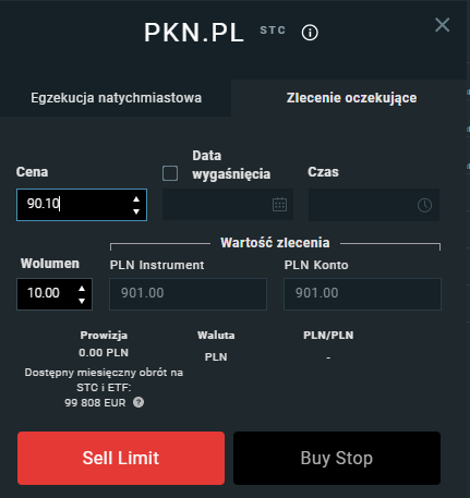 W przypadku zleceń oczekujących konieczne jest również ustawienie wolumenu, co oznacza ilość akcji, której zlecenie oczekujące TP/SL powinno dotyczyć.