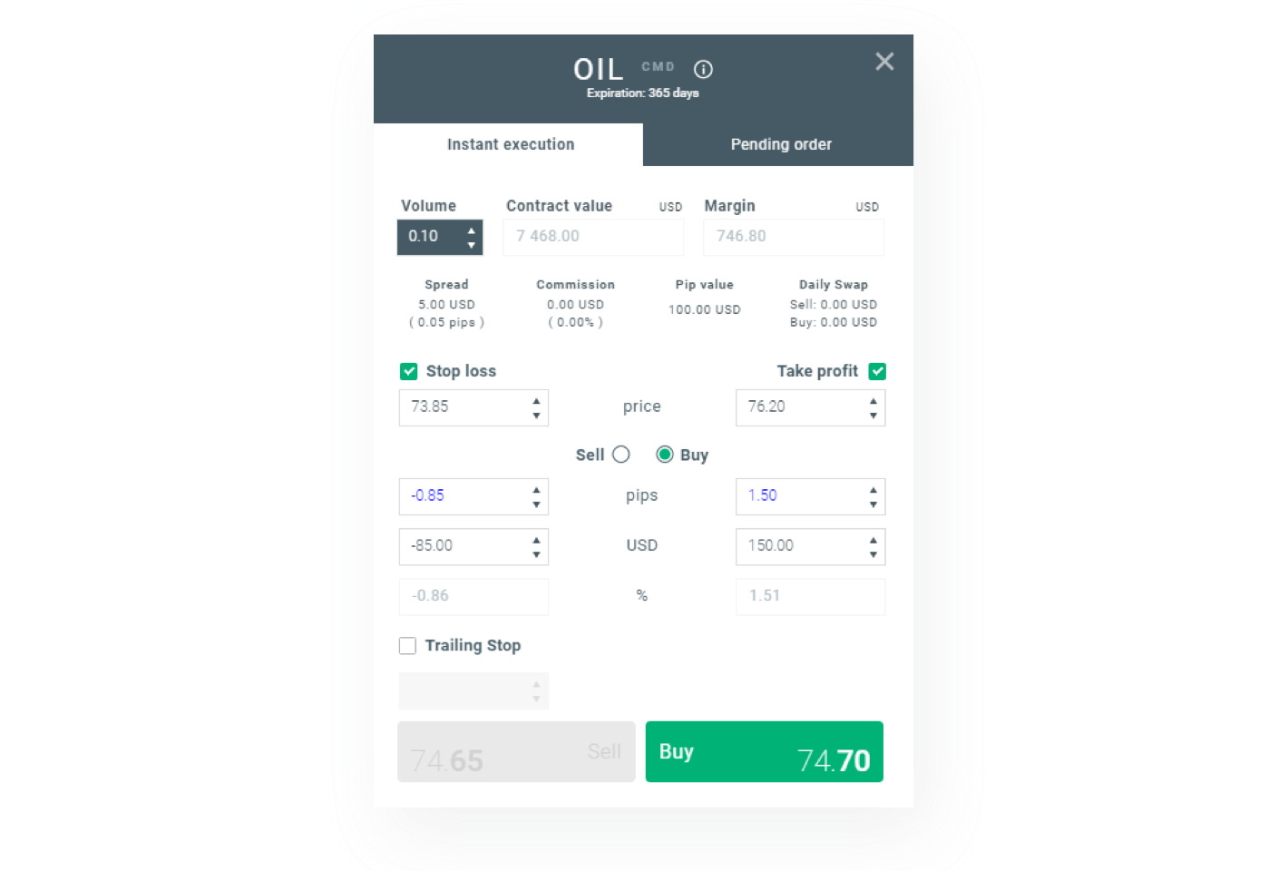 Vamos perceber como é que pode executar uma ordem de compra também conhecida como posição longa no mercado. Suponhamos que, depois de analisar o mercado, crê que o preço do petróleo vai subir no curto prazo. Em primeiro lugar, deverá determinar o valor da sua exposição no mercado. Em seguida, deverá definir o seu Stop Loss para limitar as suas perdas e definir também uma zona de Take Profit que fechará de forma automática quando o preço atingir a meta definida. A maneira mais fácil de executar uma nova transação é através da opção no painel click & trade, que pode ser encontrado no lado esquerdo do ecrã no módulo Market Watch.