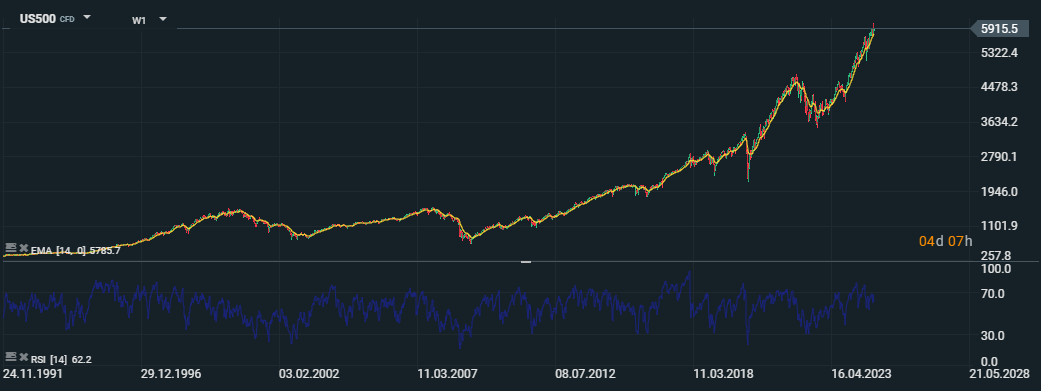 S&P 500 na vzostupe: Index dosiahol novú rekordnú úroveň 5 915,5 bodov. Technická analýza odhaľuje silný býčí trend, podporený EMA (14) a RSI na úrovni 62,2. Zdroj: xStation5