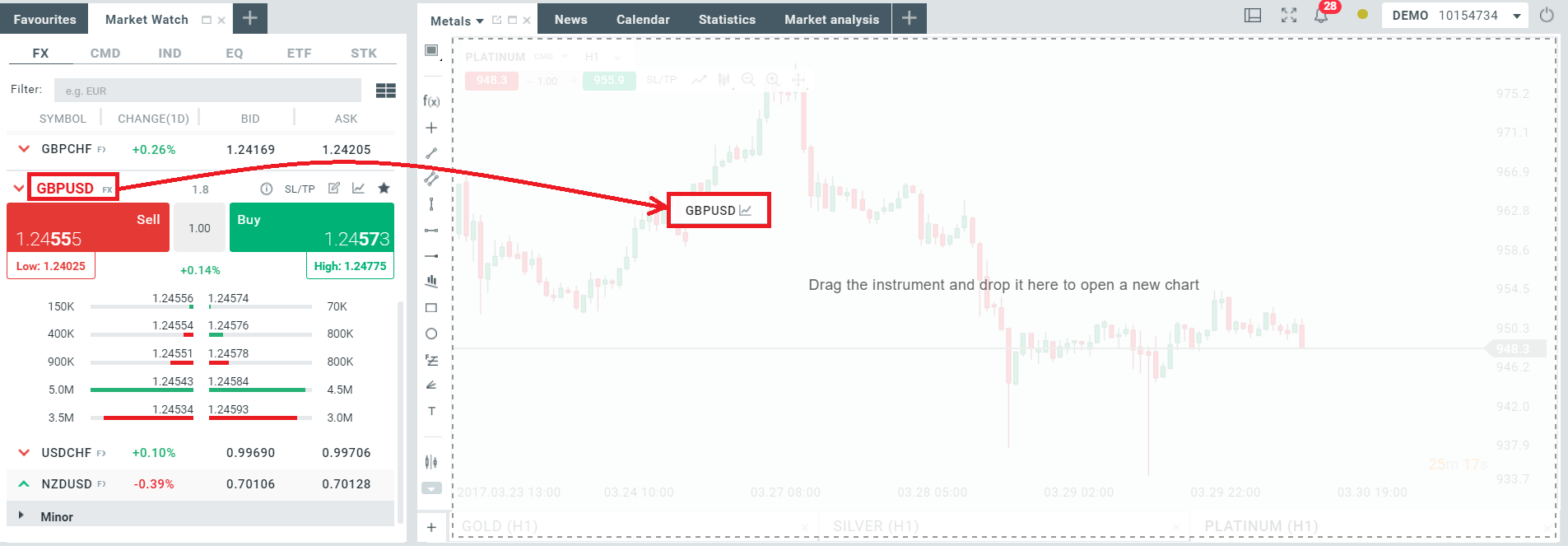 Nếu bạn chỉ muốn thay thế một biểu đồ mà không cần thêm biểu đồ mới, bạn chỉ cần ‘kéo và thả’ biểu đồ, bằng cách kéo tên công cụ từ mô-đun Market Watch vào bất kỳ khu vực biểu đồ nào.