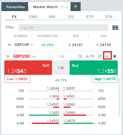 Bạn cũng có thể thêm các biểu đồ mới từ cửa sổ Market Watch chỉ bằng cách nhấp chuột trái vào biểu tượng biểu đồ: