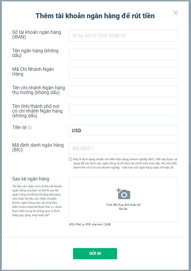 Sau đó bạn hãy điền thông tin tài khoản ngân hàng mà bạn muốn rút tiền về, đồng thời tải lên một bản sao kê ngân hàng của tài khoản đó để chúng tôi có thể xác minh thông tin mà bạn đưa ra là chính xác (Điều này được yêu cầu bởi các cơ quan quản lý của XTB). Và bạn cũng chỉ cần thực hiện việc này một lần duy nhất, những lần sau đó, tiền sẽ tự động được chuyển đến tài khoản này.