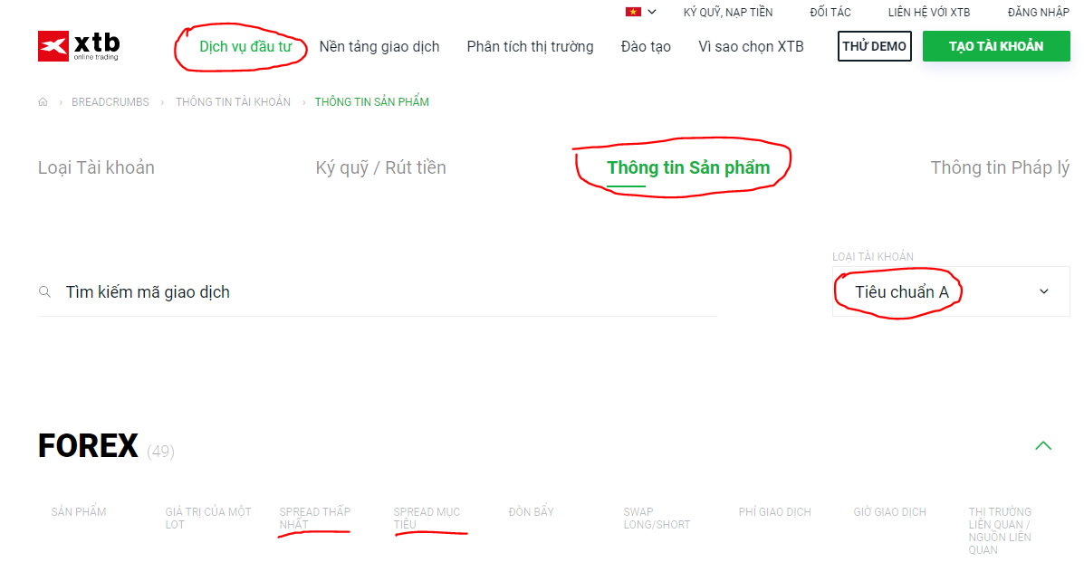 Bạn có thể tìm thấy spread của các sản phẩm tại XTB tại mục Thông tin Sản phẩm, thuộc phần Dịch vụ đầu tư, hoặc bấm vào đây